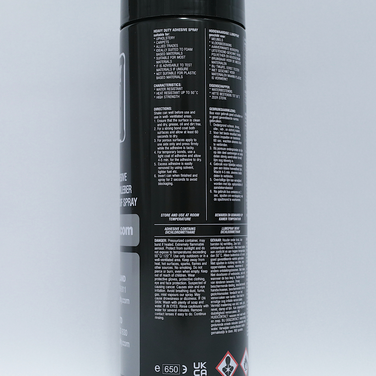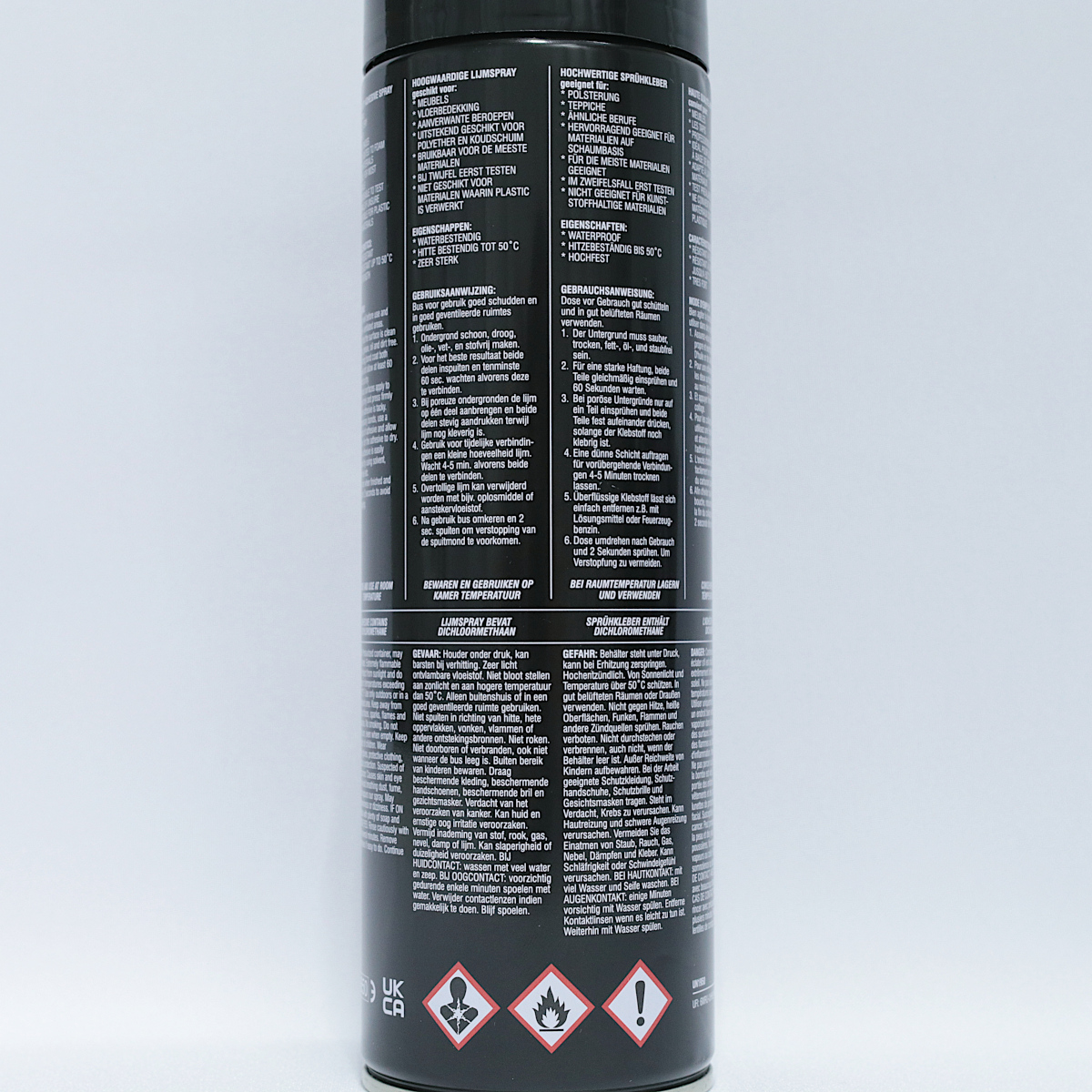 Er ist wasserfest, hitzebeständig bis 50 °C, hochfest klebend und haftet auch auf porösen Oberflächen. Das ideale Klebespray für ein dauerhaftes, festes Verkleben von mittelschweren Materialien wie Leder und Kunstleder.