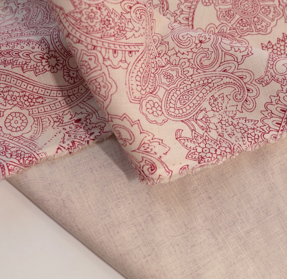Produktinformationen "beige reines Leinen mit rotem Paisley Muster Bedruckt"